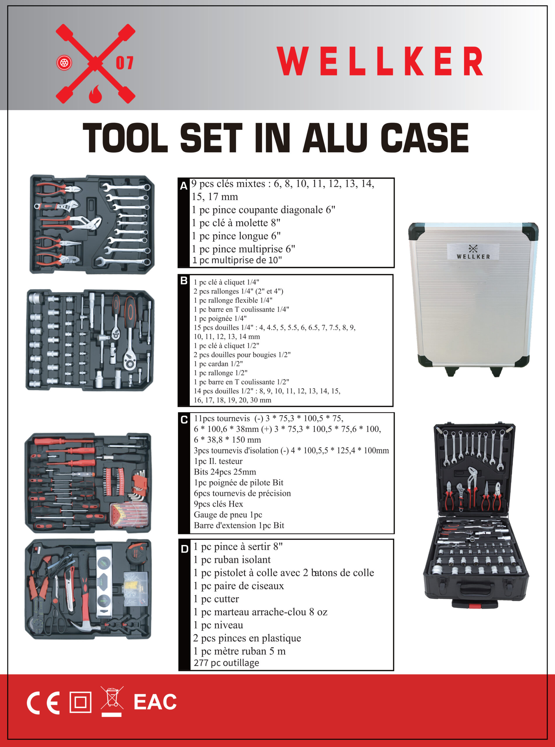 - 15 douilles 1/4″ : 4, 4,5, 5, 5,5, 6, 6,5, 7, 7,5, 8, 9, 10, 11, 12, 13, 14 mm